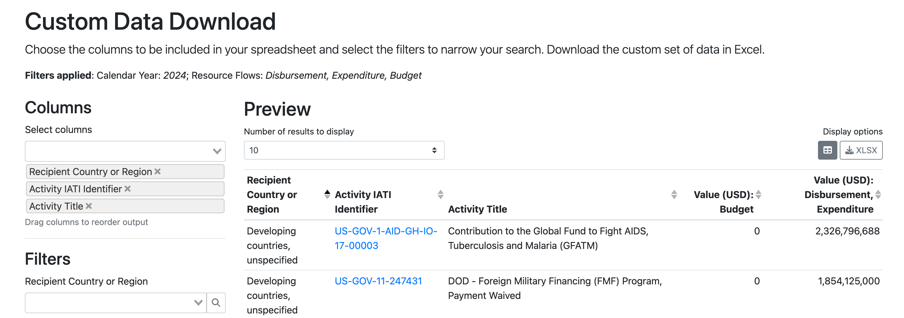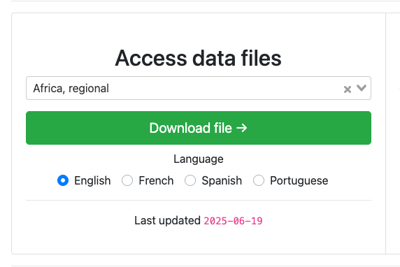 The full processed data set for each Recipient Country/Region can be downloaded from the CDFD homepage. Each file is downloadable in English, French, Spanish, or Portuguese (where available), in spreadsheet format.